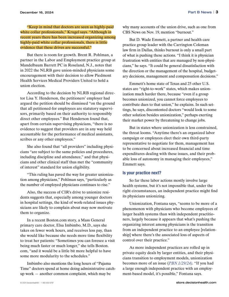 Thanks to Part B News for quoting me in their December 2024 article “As Doctors Unionize, Practices Advised to Strengthen Employee Relations,” which is reproduced below.
