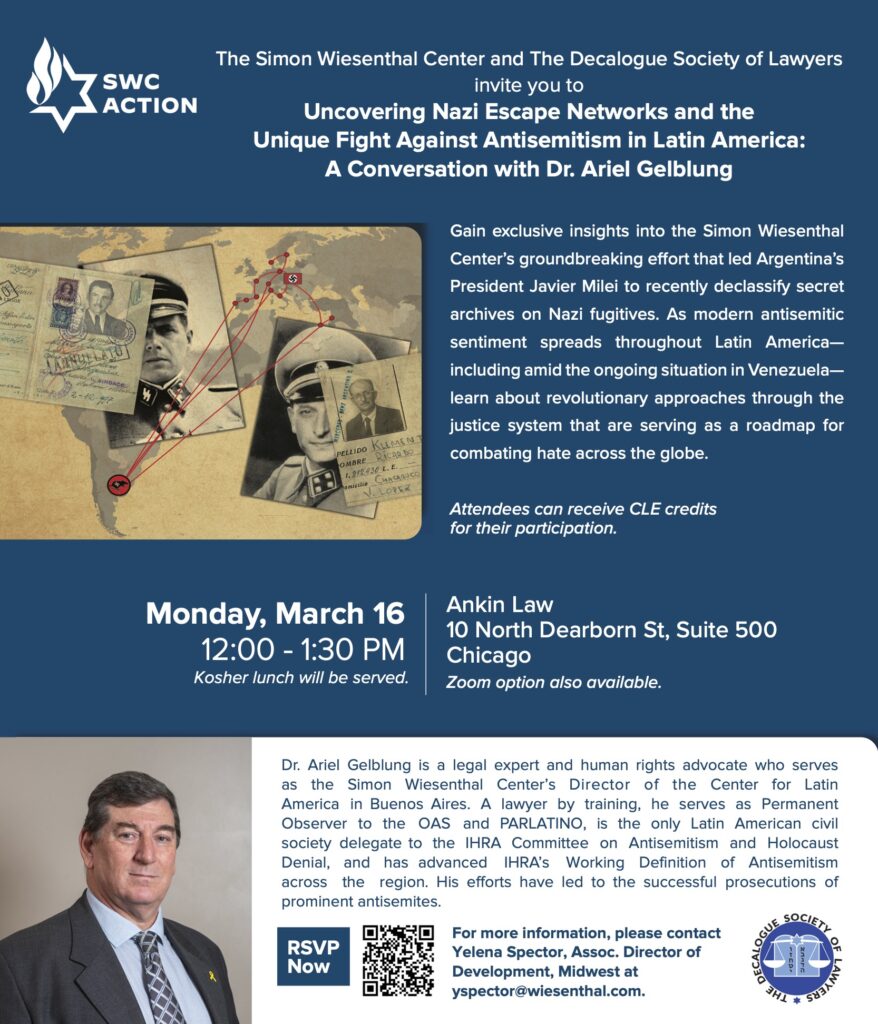 The post 3/16/26 CLE: Dr. Ariel Gelblung Speaks on Uncovering Nazi Escape Networks Sponsored by the Simon Wiesenthal Center & The Decalogue Society of Lawyers appeared first on Charles A. Krugel.