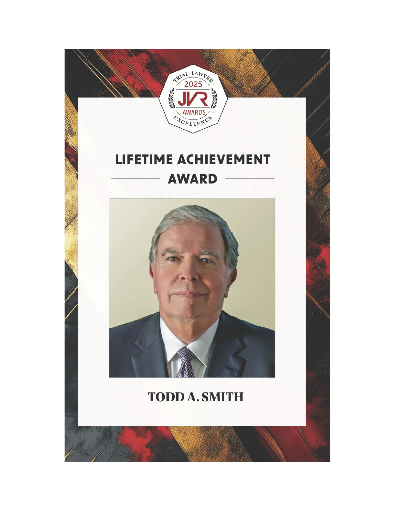 We are pleased to share that Todd A. Smith has received the 2025 Trial Lawyer Lifetime Achievement Award. His outstanding career and successes have been captured in this special issue of the Jury Verdict Reporter. Todd is recognized for his exceptional advocacy, high-dollar verdicts, and ethical standards throughout his passionate career as a personal injury trial attorney.